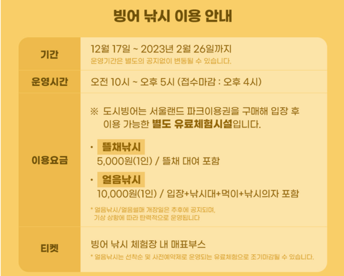 | 참고사항 | -눈썰매 제공(개별 눈썰매 이용불가) -날씨와 공원사정에 의해 조기 종용될 수 있음 |