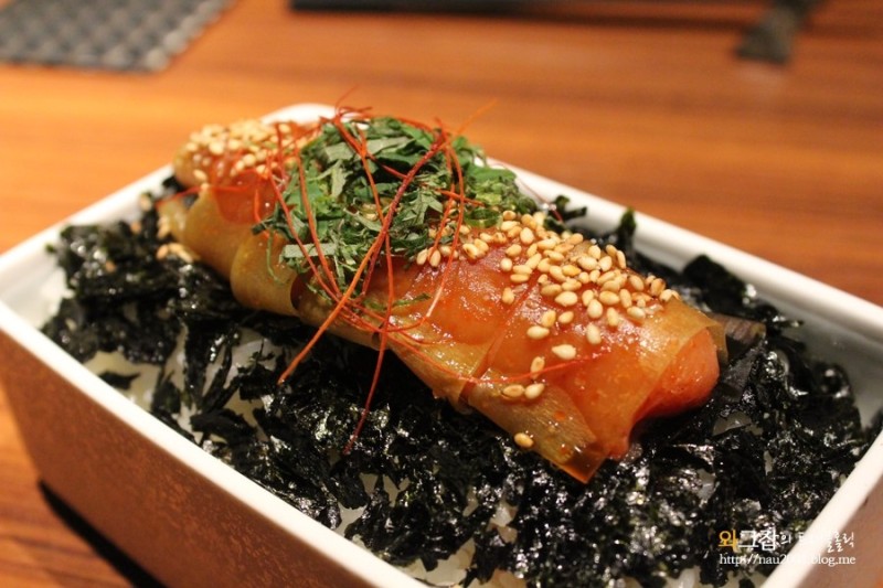 이번 음식은 멘타이쥬라는 음식입니다. 밥 위에 김가루를 뿌리고, 위는 명란, 시소와 함께 먹는다고 합니다.