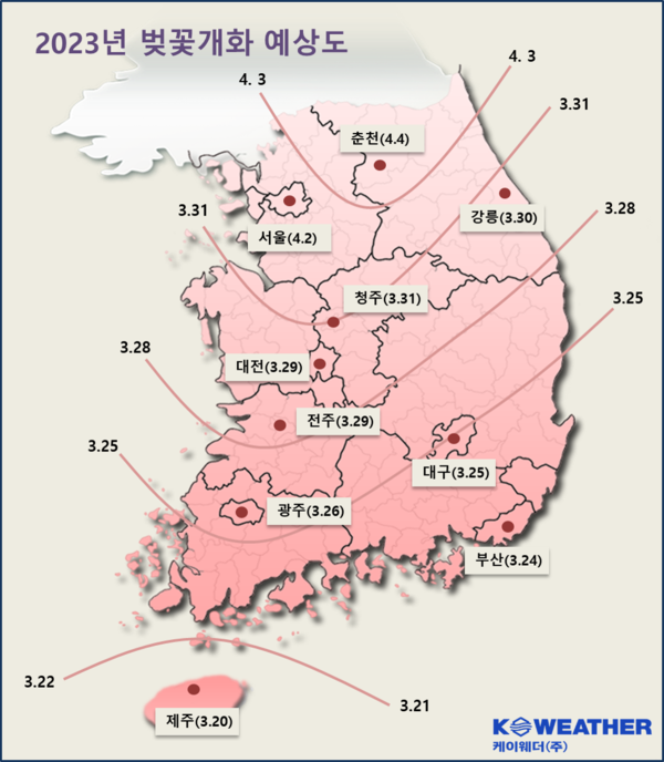 2023년 지역별 벚꽃 개화 일정을 예상해보면 22년에 비해 일주일 정도 차이날 것으로 보입니다. 제주도는 3월 20일 ~ 24일, 부산은 3월 24일~26일, 서울은 3월 28일 ~ 4월 1일 사이 벚꽃을 볼 수 있습니다.