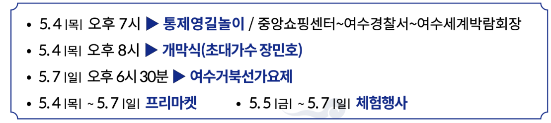 - 5월 4일 : 통제영길놀이/중앙쇼핑센터-여수경찰서-여수세계박람회장